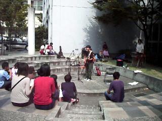中庭にでると、フォークソング部のメンバーが頑張っていました まだ10時過ぎだというのに たくさんお客さんが来てくれていますね