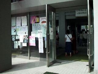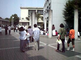 受付を終えて順に学校の中に歩いていきましょう あちこちの窓に模擬店の宣伝が出されています