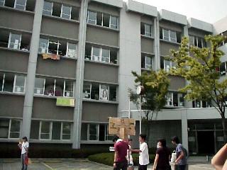 受付を終えて順に学校の中に歩いていきましょう あちこちの窓に模擬店の宣伝が出されています