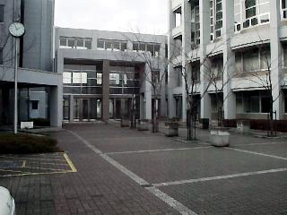 中央部は渡り廊下があります。一般教室と専門教室などをつないでいます。 向かって左側が一般教室で、右側が専門教室のようです。