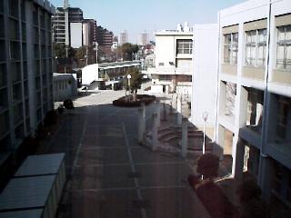 まず、校舎の渡り廊下から中庭を観察。 緑地帯が少ないように見えますが、 正門付近と校舎南側に結構樹木が有りました。