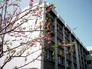 1999年4月 春を迎えた天王寺高校 左:正門左に咲く桃の花、 右:校内唯一?の桜の花(卒業記念樹です)